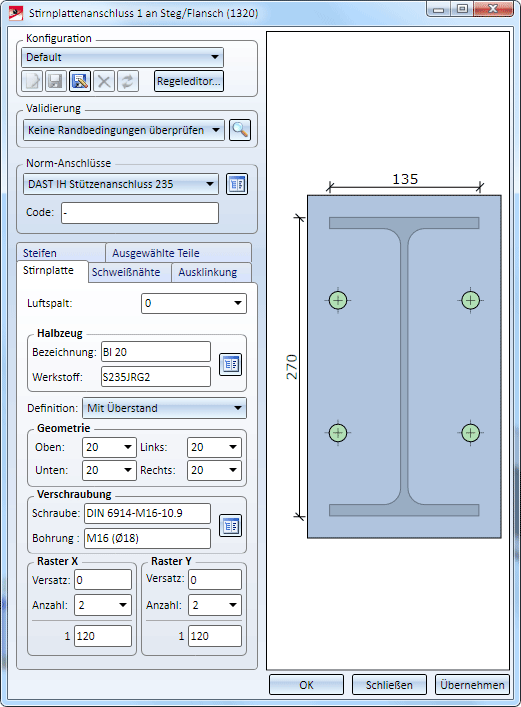 Dialogfenster Stirnplattenanschluss 1 an Steg/Flansch (1320)