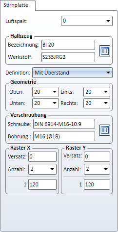 Das Dialogfenster für den Stirnplattenanschluss 1 wird angezeigt. Die Konfiguration des Strinplattenanschlusse erfolgt über die Registerkarten dieses Dialogfensters.