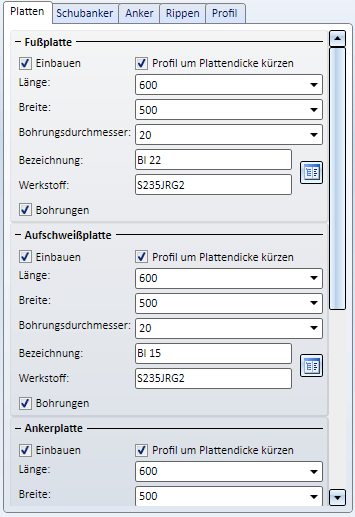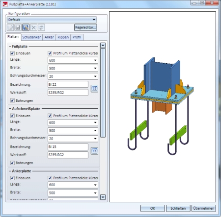 Hier legen Sie fest, welche Platten eingebaut werden sollen und Sie bestimmen die Plattengröße. Unterstützt werden Fuß-, Anker- und Aufschweißplatten.