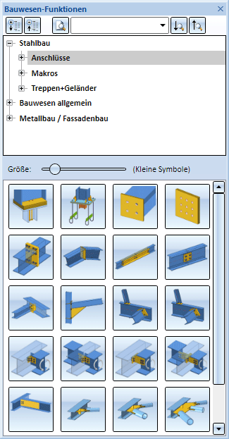 Anschlüsse, Verbindungselemente, Treppen und Geländer sowie vordefinierte Objekte und Baugruppen aus dem Bereich Stahl-/Metallbau lassen sich mit der Funktionen des Andockfensters Bauwesen-Funktionen einbauen.