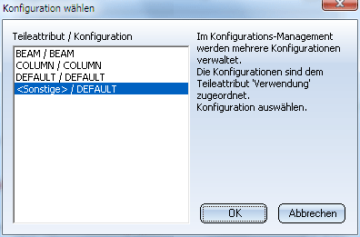 Neben der oben genannten Einstellungsmöglichkeit, können Sie für die Werkstattzeichnung auch Konfigurationen nutzen, die mit dem neuen ISD-Konfigurationsmanagement verwaltet werden. Diese Konfigurationen bieten über die Optionen des Dialogfensters hinaus weitere Möglichkeiten zur Erstellung individueller, kundenspezifischer Werkstattzeichnungen und sind dem Teileattribut Verwendungsart zugeordnet. Beispielsweise lassen sich so Verwendungszweck-abhängige Werkstattzeichnungen, z.B. für Träger, Stützen oder Riegel erstellen und individuelle Bemaßungsregeln für jedes Maß der Werkstattzeichnung definieren. Diese Konfigurationen sollten ausschließlich von einem Administrator erstellt und Ihnen zur Verfügung gestellt werden. ISD-seitig sind verschiedene Verwendungsart-abhängige Konfigurationen (Beam=Träger, Column=Stütze) vordefiniert:
