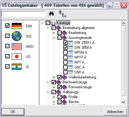 In der linken Spalte des CatalogueMakers werden die aktuell vorhandenen Normen angezeigt. Das Kontrollkästchen vor dem Normsymbol zeigt dabei an, ob die jeweilige Norm aktiv ist oder nicht. In der rechten Spalte werden die Kataloge und Tabellen angezeigt.