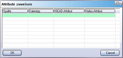 Klicken Sie zweimal in das Feld unter Spalte und wählen Sie die Spalte, der Sie Attribute zuordnen wollen aus der Liste aus. Das Feld Datentyp wird automatisch entsprechend gefüllt. Wählen Se dann unter HiCAD- bzw. HELiOS-Attribut das Attribute aus, das Sie der Spalte zuordnen wollen.