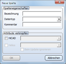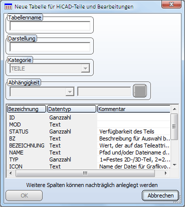 Das Dialogfenster Neue Tabelle für HiCAD-Teile und Bearbeitungen wird geöffnet.