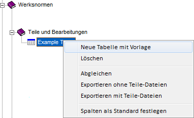 Dazu starten Sie den Katalogeditor (CATEDITOR.EXE im HiCAD EXE-Verzeichnis). Dort öffnen Sie den Katalog Werksnormen > Teile und Bearbeitungen. Klicken Sie dann mit der rechten Maustaste auf den Eintrag Example Tab-1 und wählen Sie im Kontextmenü die Funktion Neue Tabelle von Vorlage.