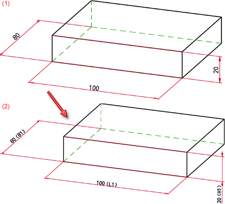 Anschließend doppelklicken Sie im Featureprotokoll auf die gewünschten Abmessungen, z.B. die Länge, und geben dann anstelle eines festen Wertes einen Variablennamen, z.B. L1 an. Dieser Variable ordnen Sie dann einen Wert zu.