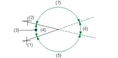 Bei Winkel < 180° besteht die Möglichkeit, den durch die beiden Schenkel gebildeten Winkel (4) zu bemaßen, sowie den zugehörigen Scheitelwinkel (6) und die beiden Nebenwinkel (5) und (7).
