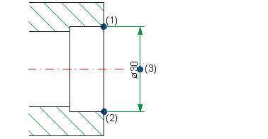 Mit dieser Funktion können Sie Wellen in der Seitenansicht mit einem Durchmesserzeichen versehen. Das Durchmesserzeichen wird vor das Maß gesetzt. Geben Sie zwei Punkte für die Durchmesserbemaßung an und bestimmen Sie einen Punkt für die Lage der Maßzahl.