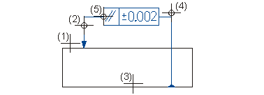 (1) Bezugslinie für Anfangspunkt, (2) Bezugspunkt für erste Linie, (3) Bezugslinie für Endpunkt, (4) Bezugspunkt für zweite Linie, (5) Lage des Toleranzrahmens |
