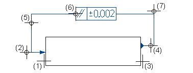(1) Bezugslinie für Anfangspunkt, (2) Bezugspunkt für erste Linie, (3) Bezugslinie für Endpunkt, (4) Bezugspunkt für zweite Linie, (5) Knickpunkt, (6) Lage des Toleranzrahmens, (7) Knickpunkt |