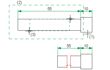 2D-Teil > Hilfen > PullDown-Menü Bohrung > Verkürzte Darstellung, in X-Richtung ![]()