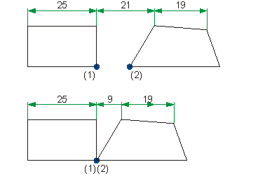 Transformation mit Bemaßung. Punkt (2) wird nach Punkt (1) verschoben und die Bemaßung angepasst.