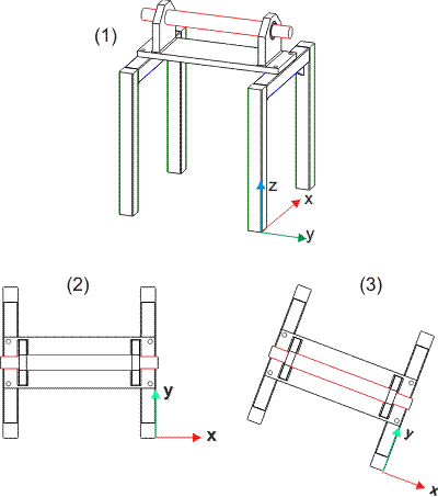 Die Abbildung zeigt die Standardaxonometrie (1) eines 3D-Modells, die normale Draufsicht (2) und die in Fluchtrichtung ausgerichtete Draufsicht (3).