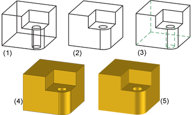 (1) Glasmodell, (2) Hidden-Line, (3) Hidden-Line gestrichelt, (4) Schattiert mit Kanten, (5) Schattiert ohne Kanten
