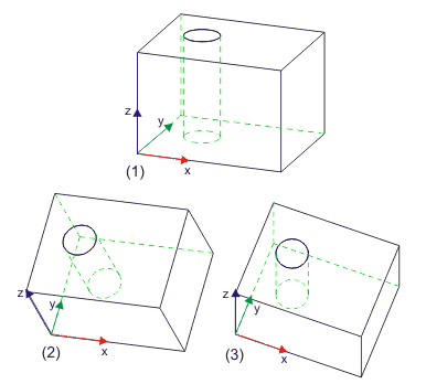 (1) Ausgangsansicht, (2) Drehung um X-Achse des Welt-KS (45°), (3) Drehung um X-Achse des Bild-KS (45°)