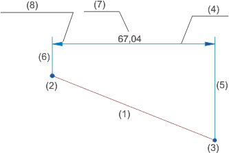 (1) Bemaßte Strecke, (2,3) Maßfußpunkte, (4) Maßlinie, (5,6) Maßhilfslinien, (7) Maßzahl, (8) Maßlinienbegrenzung
