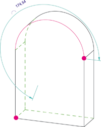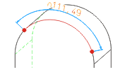 Bogenmaß ermittelt das Bogenmaß zwischen Anfangs- und Endpunkt eines Bogens. Die Maßhilfslinien liegen parallel zur gedachten Winkelhalbierenden des Kreissektors und beginnen an den Bogenendpunkten. Maßlinie und Bogen sind konzentrisch. |