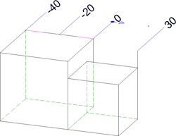 Neues Koordinatenmaß erzeugen spezielles achsparalleles Bezugsmaß, bei dem der erste identifizierte Punkt als Bezugspunkt interpretiert wird. Von diesem Punkt aus wird jeweils das Absolutmaß zwischen dem Bezugspunkt und den anderen Maßpunkten ermittelt. Der Bezugspunkt wird mit 0 gekennzeichnet. |