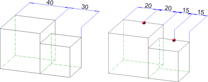 Mit dieser Funktion erweitern Sie vorhandene Bemaßungsstrukturen wie Ketten-, Stufen- oder Bezugsmaße um neue Teilmaße, d.h. Sie fügen zusätzliche Maßpunkte ein.