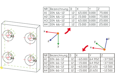 verschobene Beschriftungen einer Tabellenbemaßung werden beim Aktualisieren wieder an dieselbe Position relativ zu ihrem Fixpunkt gesetzt.Die Bohrungstabelle bezieht sich normalerweise auf den angegebenen Bezugspunkt und das Weltkoordinatensystem. Sie haben jedoch auch die Möglichkeit, die Tabelle bezogen auf ein lokales Koordinatensystems zu erzeugen. Dazu muss beim Aufruf der Funktion ein lokales Koordinatensystem aktiv sein!