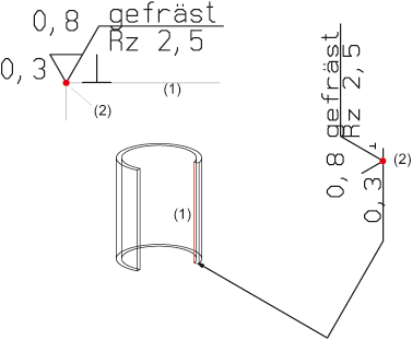 Ohne und mit Hinweislinie: (1) Kante, (2) Bezugspunkt