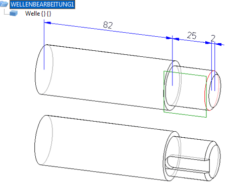 - Bei Nuten Bei den Nuten für Bohrungen (z.B. DIN 6885-1) kann nach der Identifizierung der Einbaukante zusätzlich eine Länge eingegeben werden. Wird die automatisch angezeigte Länge übernommen, dann wird eine durchgehende Nut erzeugt. Wird der Wert geändert, dann gilt diese Länge ab der Einbauposition.