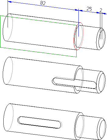 - Die Position der Passfedernut lässt sich auch durch den Einsatz von Bearbeitungsebenen beeinflussen. Wird vor der Passfedernut-Erstellung eine Bearbeitungsebene auf die Mantelfläche gelegt, dann wird die Passfedernut an der Position der Ebene erstellt. Durch Austauschen der Bearbeitungsebene im Feature kann die Passfedernut nachträglich gedreht werden.