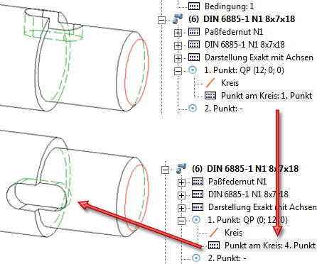 - Die Passfedernut lässt sich auch durch Angabe eines Quadrantenpunktes oder eines Punktes relativ zu einem Quadrantenpunkt an die gewünschte Position in der Mantelfläche bringen. In diesem Fall können Sie die Passfedernut durch Auswahl eines anderen Quadrantenpunktes im Feature-Protokoll nachträglich drehen.