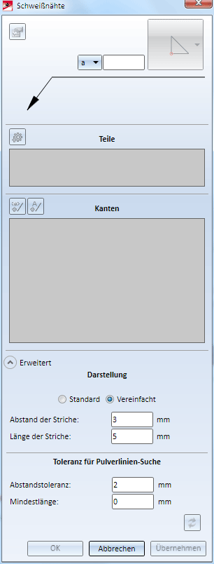 Oben im Dialogfenster können Sie die Einstellungen für die Schweißnahtfahne vornehmen, d.h. den Schweißnahttyp und weitere für diesen Typ erforderliche Angaben wie die Schweißnahtdicke. Anstelle der Auswahl von a-Maß oder z-Maß können Sie in der Listbox auch den Leereintrag wählen.