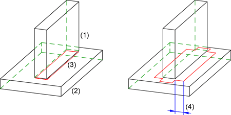 In der folgenden Abbildung ist eine Kehlnaht zwischen den beiden Quadern (1) und (2) eingefügt worden, wobei die Pulverlinien (3) automatisch bestimmt wurden (4=Länge der Striche).