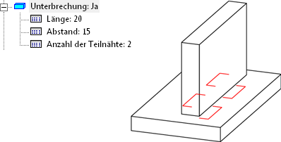 Bei der vereinfachten Darstellung wird am Anfang und Ende der Schweißnaht (bei unterbrochenen Schweißnähten pro Teilnaht) je eine Linie der angegebenen Länge sowie die Verbindung dieser beiden Linien erzeugt.