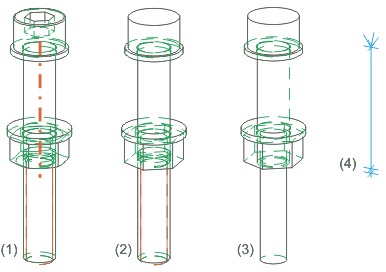 (1) Detaillierte Darstellung ein, (2) Komprimierte Darstellung, mit Gewinde ohne Achse, (3) Komprimierte Darstellung, ohne Gewinde und Achse, (4) nur Achse