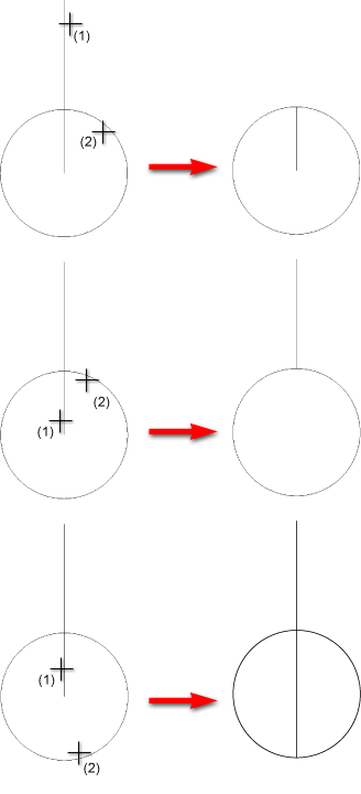 Beim Trimmen einer Linie an einem Kreis oder Bogen wird der gewählte Linienabschnitt bis zu dem Schnittpunkt mit der Kreis/Bogen verkürzt bzw. verlängert, der dem Identifizierungspunkt (für den Kreis/Bogen) am nächsten liegt.