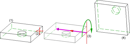 (1) Original mit identifizierter Drehachse (2), (3) Kennzeichnung der Drehachse und -richtung, (4) gedrehtes Teil