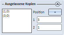 Wie bei den anderen Musterwiederholungen haben Sie auch hier die Möglichkeit, einzelne Kopien auszulassen, d.h. nicht zu generieren. Bei dieser Angabe muss aber hier die Anzahl der Arbeitsschritte (Muster) berücksichtigt werden. Außerdem hat hier das Original des jeweiligen Bearbeitungsschrittes die Nummer 0.