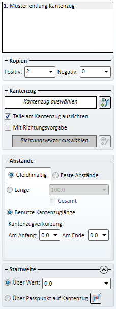 Muster entlang Kantenzug Die Eingabefelder sind identisch mit denen der Funktion Teil wiederholen, Verschieben - parametrisch entlang Kantenzug. |