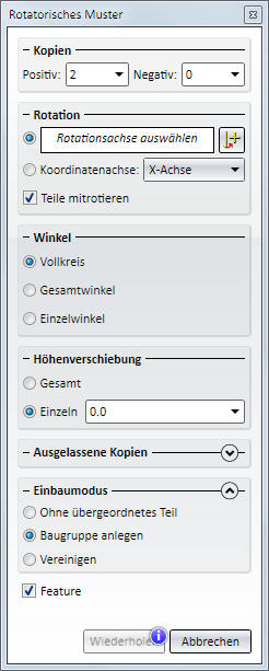 Ist die Checkbox aktiv, dann wird für die Wiederholung ein Feature angelegt. Dieses Feature wird je nach Einbaumodus entweder der Baugruppe oder dem Original zugeordnet.
