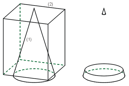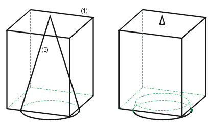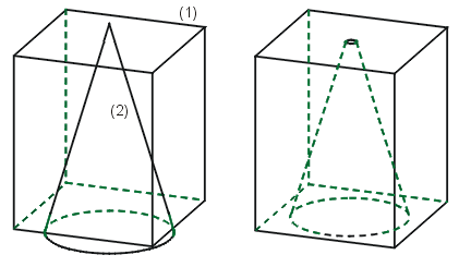Links: (1) Aktiver Kegel, (2) zu subtrahierender Quader