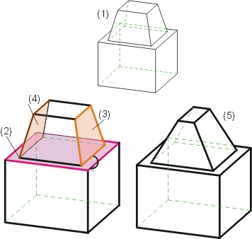 (1) Ausgangsteil, (2) Bezugsfläche, (3) und (4) gewählte Flächen, (5) Formschräge mit Drehwinkel -15°