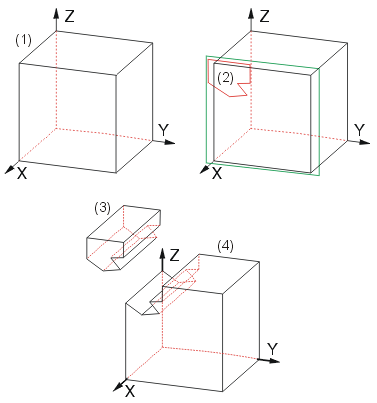 der Axonometrie, (2) Skizze für die Schnittkontur, (3) und (4) Entstehende