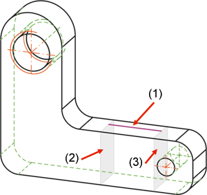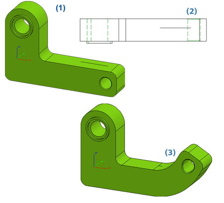 Dabei bestimmt die Skizzenebene die neutrale Faser für die Deformation. Das heißt, der zu deformierende Bereich des gewählten Teils wird bestimmt durch die Ebenen (2), (3) die senkrecht zum Anfangs- und Endpunkt der Skizze (1) stehen.
