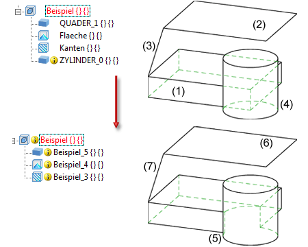 Unten: Teil nach Auflösung der Nebenteilebenen: (5) Boolesche Vereinigung der Solids, (6) Teil mit freien Flächen, (7) Teil mit freien Kanten