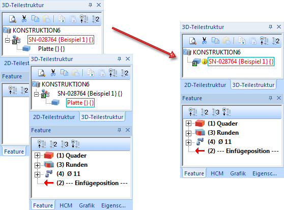 Die Abbildung zeigt links eine referenzierte Baugruppe mit einem untergeordneten Teil und rechts die Baugruppe nach Ausführung der Funktion Nebenteilebenen auflösen.