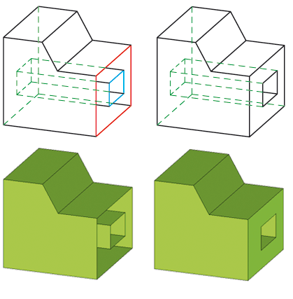 Flächen mit Innenzyklen sollten Sie zunächst wie mit der Funktion interaktiv definieren. Nach Betätigen der rechten Maustaste versucht HiCAD nach dem Generieren der Einzelflächen alle anderen Flächen automatisch zu generieren. Gelingt dies nicht, wird eine Fehlermeldung ausgegeben.