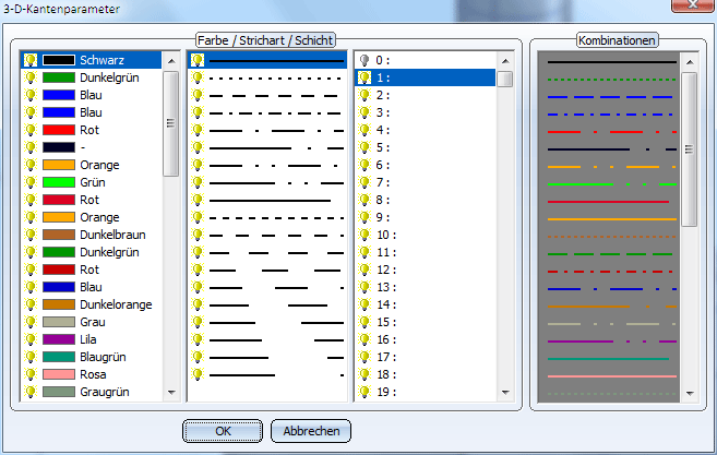 Mit dieser Funktion ändern Sie die Voreinstellung der Kantenparameter. Dies sind die Farbe, Strichart und Schicht sowie Kombinationen dieser Werte. Die Einstellungen werden bei schattierter Darstellung nicht berücksichtigt.