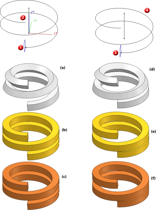Links liegt eine Spirale (2) mit konstanter Ganghöhe. Rechts eine Spirale (4) mit sich verändernder Ganghöhe. Als Richtungsvorgabe wird die Spiralachse verwendet. Die Skizzen (1) und (3) sind parallel zur vorgegebenen Richtung platziert.