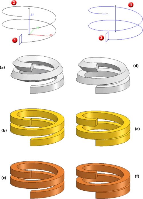 Bei unterschiedlicher Ganghöhe hat bei Konstantem Winkel mit Richtung (f) das Ende des Sweepteils den gleichen Winkel zur Leitlinie wie am Anfang, in dem die Skizze gelegen hat. (d) zeigt die Verlegung mit minimaler Rotation, (e) die Verlegung mit Richtungsvorgabe.