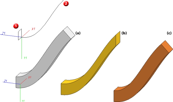 Die Skizze (1) ist an der Leitlinie (2) verlegt worden. Dabei handelt es sich um eine ebene Leitlinie. Das Ergebnis der Optionen Minimale Rotation (a) und Konstanter Winkel mit Richtung (c) ist gleich. Bei (b) ist die Verlegung mit Richtungsvorgabe erfolgt und zwar in Kantenrichtung der Leitlinie.