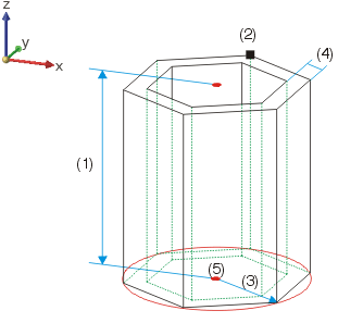 Hohlprisma: (1) Höhe, (2) Eckenzahl, (3) Radius, (4) Wandstärke, (5) Einbauposition