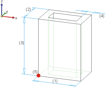 Hohlquader im Vorschau-Modus: (1) Länge, (2) Breite, (3) Höhe, (4) Wandstärke (innen), (5) Passpunkt